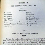 The pageant goes on to 1549, to tell of the Cornish rebellion, a story of grim and stark tragedy, in which, though the leaders were mostly gentlemen, it was essentially a rising of the peasantry of Cornwall, ending as tragically as all other peasants rebellions. Humfrey Arundell, a member of the greatest family in Cornwall, was, almost against his will, obliged to join them, and after some desperate battles in Devonshire, he fled to Launceston, where, in a battle in the streets, he was overcome and taken prisoner by the men of Launceston. The Carews, arriving soon after, took him and the other leaders to Exeter, and they were subsequently taken to London, tried, and hanged at Tyburn. The scene opens with companies of women struggling in, one of them carrying a dear little infant. They demand from the Mayor news of their men in Arundell’s army, but he tells them “but few remain, and those will be here anon, for Master Arundell rides here in all haste,” Launceston, he says, cannot countenance rebellion, and if they will not go hence their sorrows may be increased. Boys rush in shouting that the army is approaching, the Mayor orders out the town guard, and through the gate the tattered weary remnant of the Cornish rebel army appears. The Mayor informs Arundell that Launceston will not have part or lot in the wickedness of rebellion, Arundell threatens to take the city, but the town guard rush upon the rebels and overcome them after a fierce struggle. There follows the arrival of the Royal Army, led by Sir Gawen and Sir Peter Carew, they are welcomed by the Mayor. Arundell and his men are led off prisoners, the Mayor counsels the women to return to their homes and nurture their children in the fear of God and in loyalty to the King. “Ees fay,” retorts one of the women — one of this flotsam and jetsam of sad and crushed humanity — “us must go home now, and rare up the chillun in hunger, and cold, and nakedness, that they may garnish gallowstrees when they’m grown to be men.”