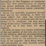 In one stride the pageant passes over a period of 200 years to 1862, for the closing episode, the rejoicing at Launceston when the news was heard that the preamble of the Bill which was to give the borough its first railway had been passed, rejoicing which, Miss Kelly says, caused more emotion in Launceston than any other event of the last century. In this episode the “giants” of those days “came to life” once more. Mr. Richard Robbins, who fought so strenuously for the coming of the iron horse; Mr. Derry, the Mayor; the Rev. S. Childs Clarke, Headmaster of the Grammar School; the Rev. G. B. Gibbons, Perpetual Curate of Launceston; Mr. Dingley, Mr. Pethybridge, Dr. Goldsworthy Gurney, and others. There they were, with groups of the towns-people and their families — in one case a couple of toddling twins — with Mr. Robbins reading the good news in the paper of those days. All seem to be of one accord, but there is a fly in the ointment in the person of a Mr. Dawe, of Callington, who doesn’t believe in “this yer railway,” remarking, “if twas to go by Callington now, I wouldn’t have nort to say against en, but —.” And then he summarily closured by Mr. Robbins, who, impatient at the thought of opposition, to his pet scheme, and speaking with some heat, declares, “we have waited for nineteen years to get a railway, and if we listened to Mr. Dawe we should wait another nineteen years.” He tells of the prosperity of Launceston thirty years before, “and now the grass is almost growing there; and what can be done to remedy the decline?” “The railway; us must have the railway.” Shouts the crowd. Mr. Dawe subsides, and a messenger rides on with a telegram, telling that the Government have accepted the Bill. The crowd goes wild with excitement. Mr. Robbins and Dr. Goldsworthy deliver speeches, the Church bells start a-ringing, two different bands march on playing two different tunes as loudly as possible, Mr. Clarke promises his boys a holiday on the morrow, children dance and sing, ladies weep and chatter, and one and all are more or less beside themselves with joy. Such was the scene, and it was portrayed with remarkable attention to dress. There were the children running out from school, to the strains of “Boys and girls come out to play,” the youngsters wearing the quaint garb of the period. The gentlemen wore a variety of headgear which was the admiration of all beholders, while the ladies; God bless them — prinked and preened in the crinolines, with their frills, furbelows, and flounces of those discreet and proper Victorian days. There was, too, that little chap, Tom, so interested in his telescope, which he had saved up to buy so that he might see the stars. Finally, there was the last little episode of all, the cheers which were spontaneously given for Miss Kelly, who, it may be mentioned, in her Book of the Pageant, expressed her thanks to Mr. Charles Henderson and the Hon. Sir John Fortescue, who had helped her with information and criticism; also to Mr. J. A. Fuller-Maitland, who composed the tune of the Cavalier litany in the forth episode. She also mentions that the late Sir Alfred Robbins showed himself deeply sympathetic with the pageant, and was indeed engaged in writing the foreword at the time of his death.